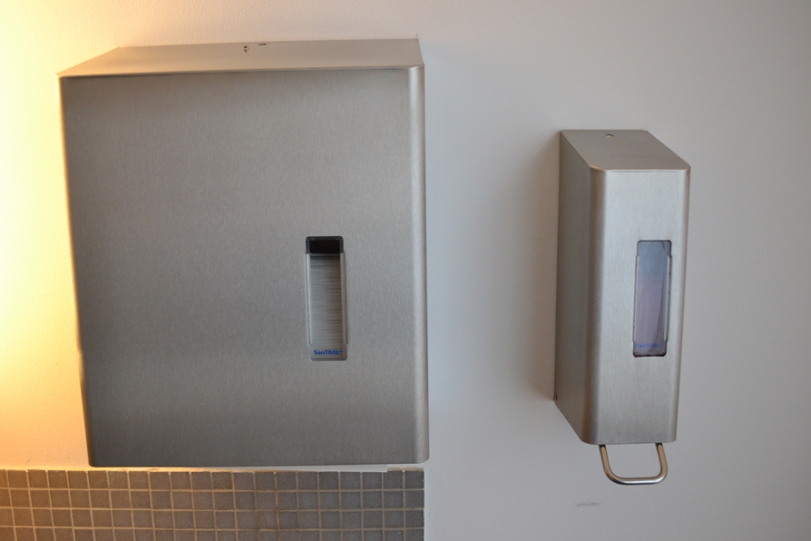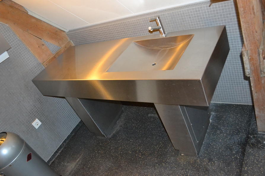 Vanuit een bedrijfsbeëindiging aangeboden: toilettafel van RVS, 168 x 60 x 90 cm. Inclusief zeepdispenser en handdoeken dispenser.